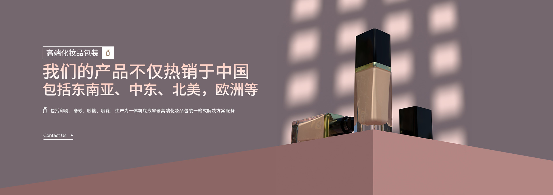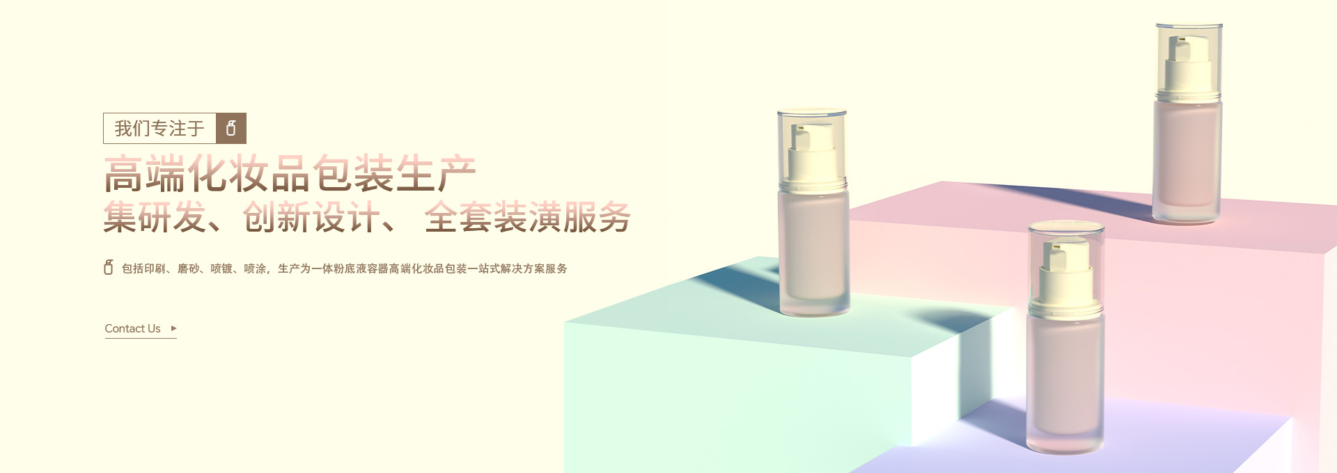 集研發(fā)、創(chuàng)新設(shè)計(jì)、 全套裝潢服務(wù),包括印刷、磨砂、噴鍍、噴涂,生產(chǎn)為一體粉底液容器高端化妝品包裝一站式解決方案服務(wù)。